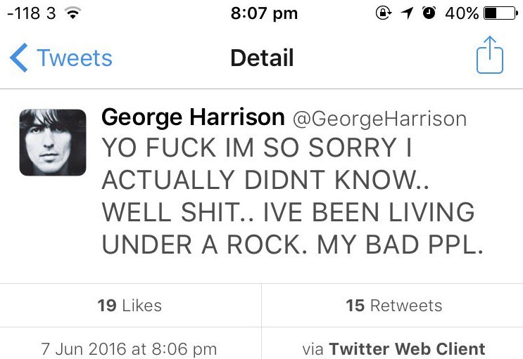 Pues para ser un experto en redes y en suplantaciones, el hacker no sabía que el guitarrista de los Beatles murió en el 2001 a causa de un cáncer de pulmón, por lo que luego se tuvo que disculpar, claro en la misma cuenta de Harrison. Hasta para hacer bromas hay que informarse un poco.