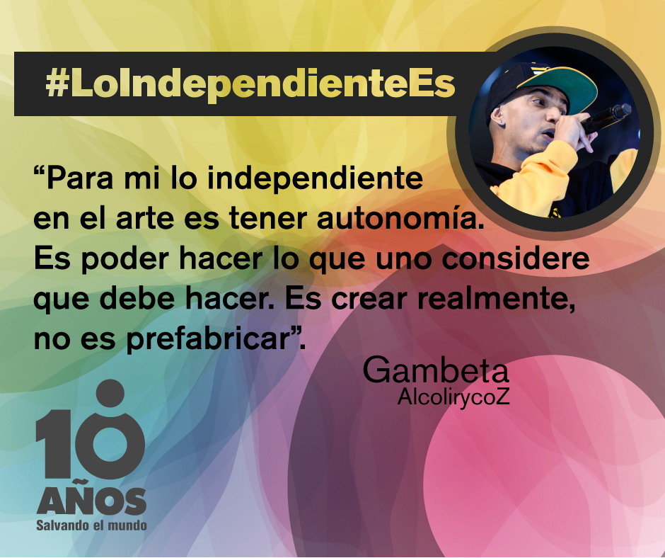 "Yo soy Gambeta de AlcolirykoZ. Para mí lo idependiente en el arte es tener autonomía. Es poder hacer lo que uno considere deba hacer. Es crear realmente, no es prefabricar que es lo que normalmente se ve cuando hablan de música o arte que agrade a todo el mundo, sino como hacer algo con el compromiso personal de agradarse uno mismo, de estar feliz uno mismo con lo que está haciendo y luego hacerlo para los demás.