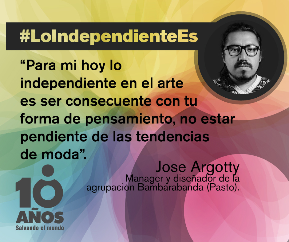 "Hola mi nombre es José Francisco Argotti. Soy un diseñador de la ciudad de Pasto y actualmente trabajo como manager y diseñador de la agrupación Bambarabanda. Para mi hoy lo independiente en el arte es ser consecuente con tu forma de pensamiento, no estar pendiente de las tendencias de moda, sino más bien salir adelante con tu forma de crear, con tu creatividad y sacar adelante tus ideas. No permitir la imposición de estándares de ninguna manera y siempre ser consecuente con su creación.
