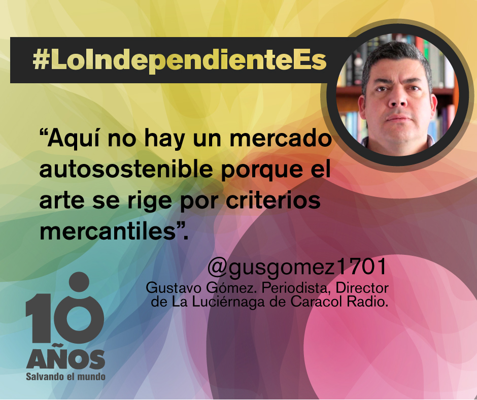 Soy Gustavo Gómez, periodista, actualmente director del programa La Luciérnaga de Caracol Radio. Lo único independiente en el arte son las ideas, lo genuino. Aquí no hay un mercado autosostenible porque el arte se rige por criterios mercantiles y suele florecer de la manera en que lo vemos como mercado en escenarios de bienestar satisfecho donde hay excedentes.