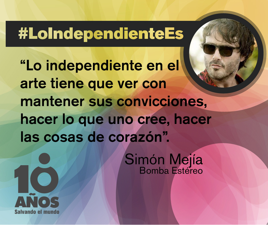 "Soy Simón Mejía de Bomba Estéreo. Pienso que lo independiente en el arte tiene que ver con mantener sus convicciones, hacer lo que uno cree, hacer las cosas de corazón, como nacen y procurando no hacer tantas concisiones a la hora de crear sus piezas artísticas.