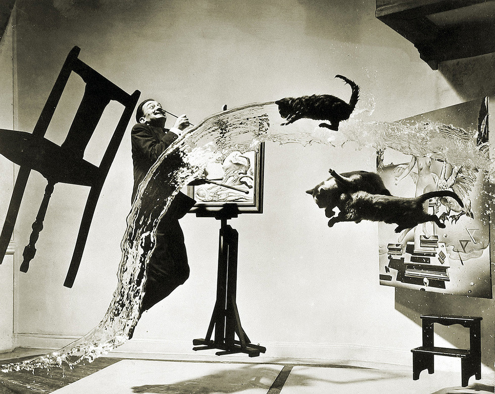 Pero, si creatividad y gatos hemos visto en el arte, no se puede dejar de lado al fotógrafo estadounidense Phillipe Halsman (1906-1976), quien retrató a un artista suspendido en el aire entre tres gatos que pasan volando, muebles flotantes y chorros de agua. Hablamos del español Salvador Dalí (1904 – 1989) y su imagen Dalí Atómicus.