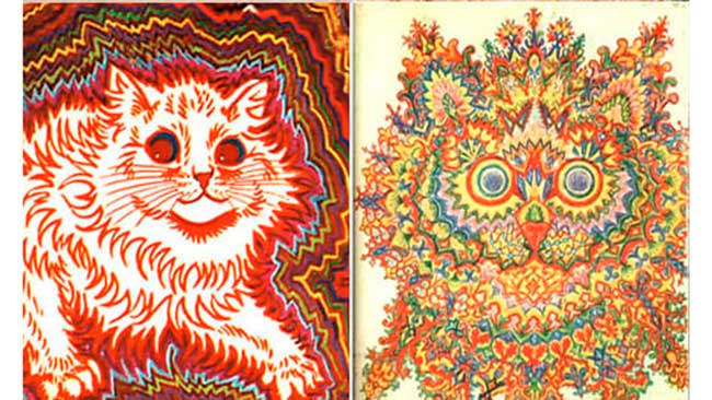 Sucedió también con el pintor inglés Luis Wain (1860-1939) quien es recordado por los gatos antropomorfos que retrató en sus pinturas y que a lo largo de los años, se tornaron cada vez más abstractas y psicodélicas. Lo anterior se le atribuye a varias enfermedades mentales que se cree el artista empezó a sufrir.