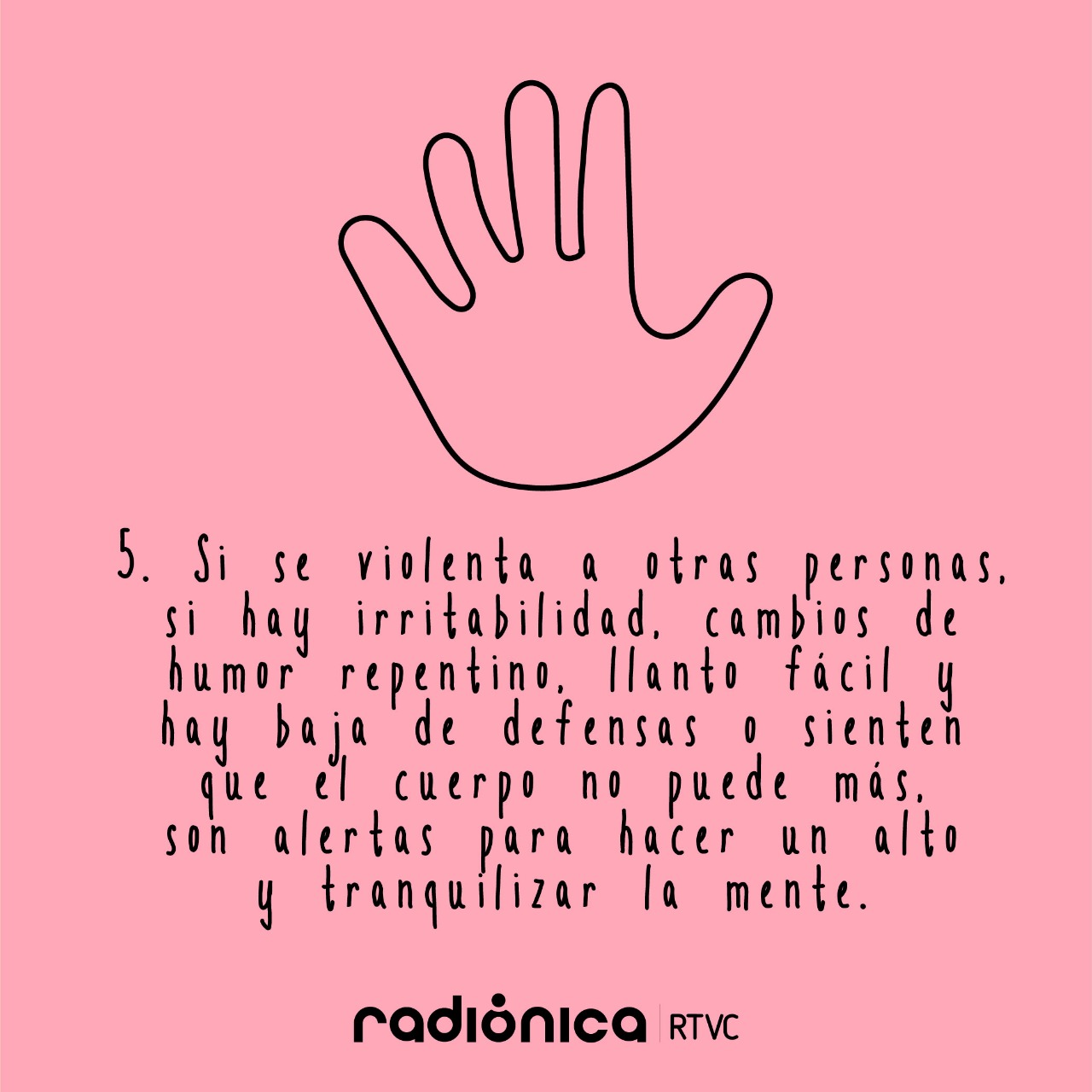 Claudia Tovar habla sobre síntomas que pueden alertar y exijan hacer un alto: “fundamentalmente cuando uno pasa a violentar a otras personas, cuando hay irritabilidad, cuando se pasa del miedo a una posición agresiva, si hay labilidad y llanto fácil, cuando se está bajo de defensas, si sientes que el cuerpo no puede más, es una alerta para hacer un alto o tranquilizar la mente para apaciguar”.