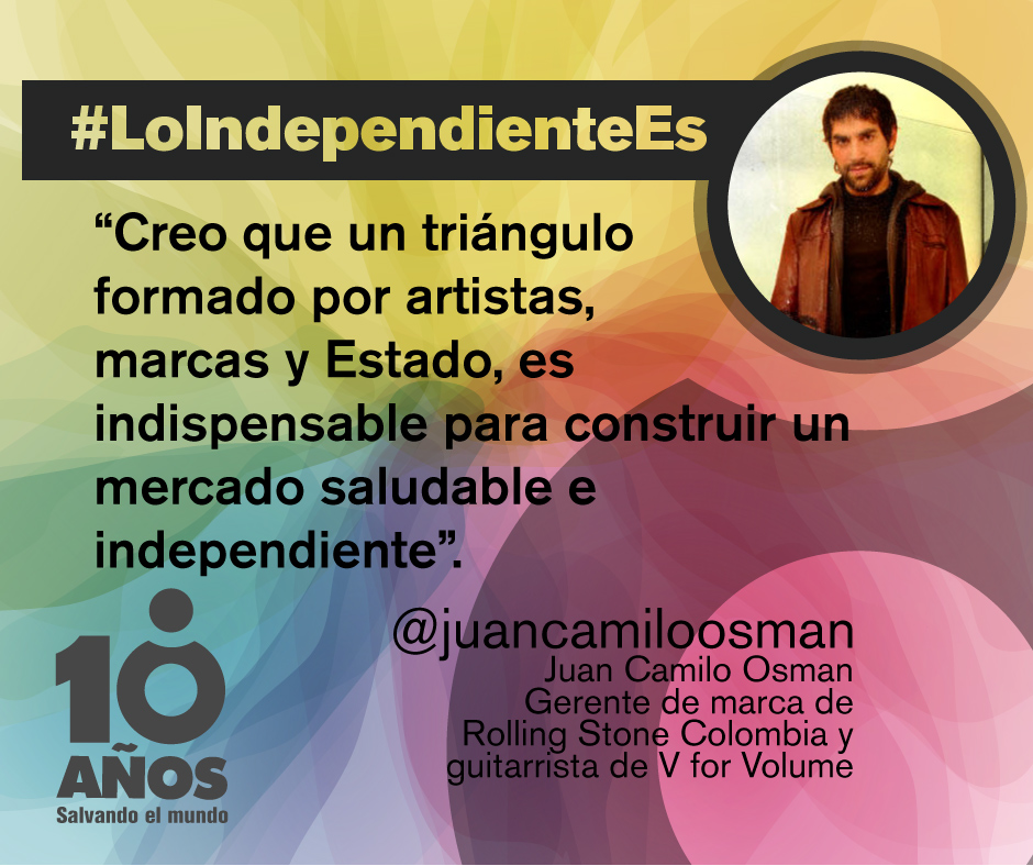 De ahí en adelante hay dos actores principales: el Estado que ha impulsado iniciativas muy puntuales como Rock al Parque y festivales al parque y festivales distritales, y por otro lado la empresa privada, que se ha dado cuenta que en la música hay un poder de convocatoria y algo que refleja el estilo de vida de muchas personas que se identifican eventualmente con sus marcas y se han pegado de ahí para lograr un beneficio mutuo: que los artistas se den a conocer y que las marcas logren sus objetivos comerciales, pero creo que esos tres actores, ese triángulo formado por artistas, marcas y Estado, es indispensable para construir un mercado saludable e independiente, aunque es un triángulo muy difícil de balancear.