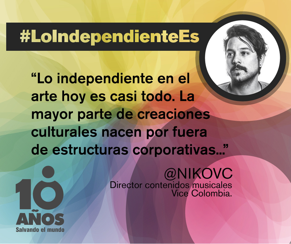 Lo independiente en el arte hoy me parece que es casi todo, porque la mayor parte de creaciones culturales nacen por fuera de estructuras corporativas o por fuera de apoyo financiero que les permitan o de las que dependan. Lo independiente nace desde la autogestión y eso es lo que estamos viviendo en la música.