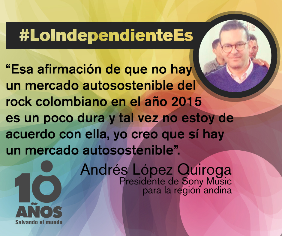 Primero tendríamos que ponernos de acuerdo en qué condiciones del mercado independiente queremos que se cumplan, si ponemos, vuelvo y repito, que la música se hace por vocación artística y no comercial, muy posiblemente no hay ninguna banda independiente bajo ese concepto, pero bajo los otros conceptos hay un montón de bandas y de cultura independiente en Colombia, es más, creo que hoy hay más que nunca (yo no soy colombiano, llevo 14 años en Colombia) y Colombia es uno de los países más ricos en cultura musical de los que yo he conocido y si no estoy mal en el mundo porque se fusionan muchísimos muchísimo ritmos por la misma fusión de culturas que tenemos en el país: africano, norteamericano, americano en general, europeo, y todas esas culturas se han fusionado en este país y hoy por hoy hay muchísima más cultura independiente en Colombia creo yo, que en cualquier otro país de América Latina; podría estar equivocado, no me he puesto a hacer en análisis para sacar estadísticas y números, pero vemos que realmente en la música colombiana el mercado independiente de música en Colombia hoy por hoy creo que es mucho más grande que nunca antes en los cortos 14 años que llevo acá y me animaría a decir que nunca antes en la historia de este país ![]()