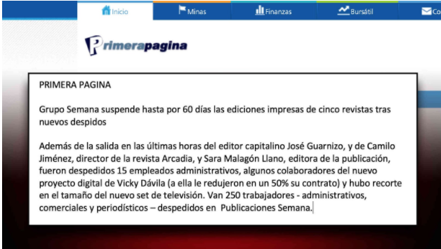 Hay que señalar sin embargo, que además de la suspensión de las mencionadas publicaciones, del despido de José Guarnizo y del equipo que lideraba Arcadia, según el portal Primera Página, también comprado por el Grupo Gilinski con la intención de fusionarlo con la Revista Dinero, “fueron despedidos 15 empleados administrativos, algunos colaboradores del nuevo proyecto digital de Vicky Dávila (a ella le redujeron en un 50 % su contrato) y hubo recorte en el tamaño del nuevo set de televisión. Van 250 trabajadores –administrativos, comerciales y periodísticos– despedidos en Publicaciones Semana”.