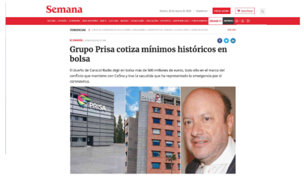 Otra reacción que llamó la atención fue la que tuvo la sección de economía de Semana cuando W Radio, con la voz de Julio Sánchez Cristo, replicó la noticia contenida en Primera Página. Lo siguiente lo evidenció Daniel Coronell en un artículo publicado en dicha revista. Un par de horas después de que la W saliera al aire con esta información, el sitio web de Semana publicó: “Grupo Prisa cotiza mínimos históricos en bolsa”. Como lo señala Coronell, para ilustrar la noticia pusieron la cara del periodista Julio Sánchez Cristo, cuando técnicamente “él no está involucrado en el manejo administrativo del Grupo Prisa, ni es responsable del comportamiento de la acción del conglomerado en un mercado estremecido como lo han estado todos por el coronavirus”.
