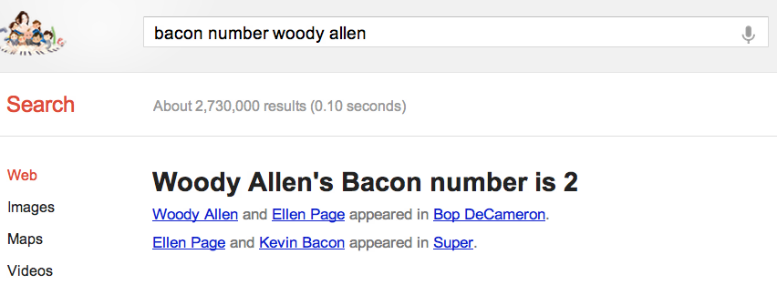 ¿Enredado? Google (en inglés) lo hace más simple. SImplemente hagan una busqueda de "bacon number" seguido del nombre del actor que quieran conectar con él. Los resultados son inmediatos. ![]()