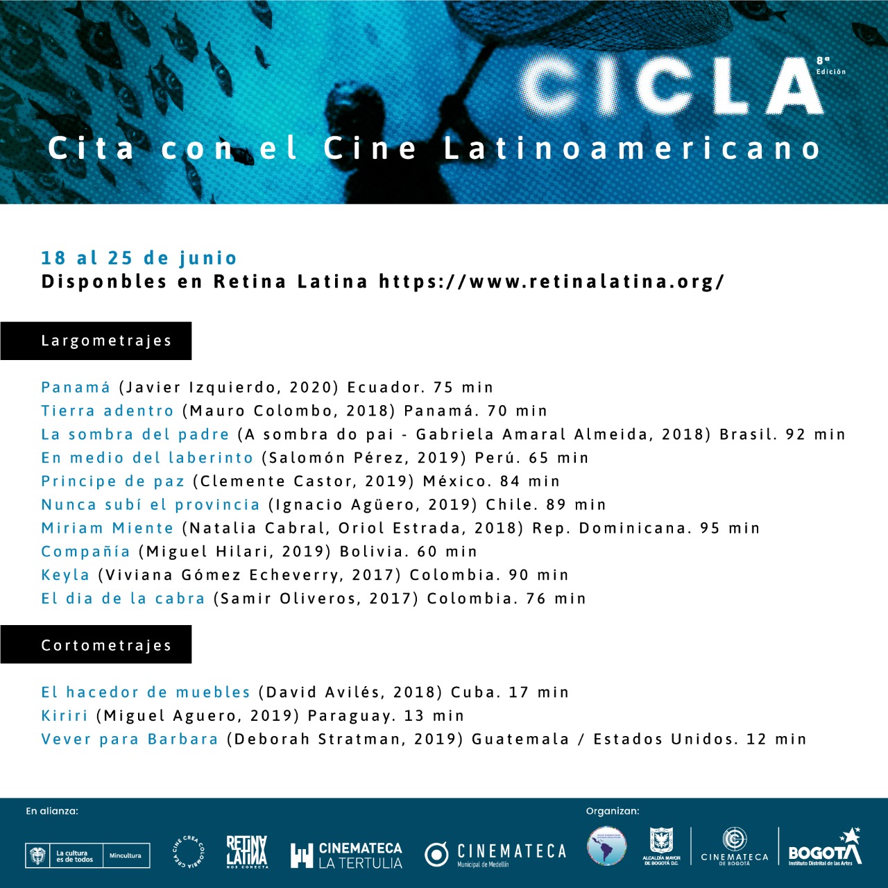 En el 2020 las reglas de juego de la CICLA han cambiado, la cita anual con el cine latinoamericano se llevará a cabo de manera virtual, en alianza con Retina Latina, una plataforma coordinada por el Ministerio de Cultura de Colombia. Este encuentro tiene como finalidad consolidar un espacio de reflexión sobre el cine hecho en Latinoamérica, y también acercarlo también a nuevos públicos.