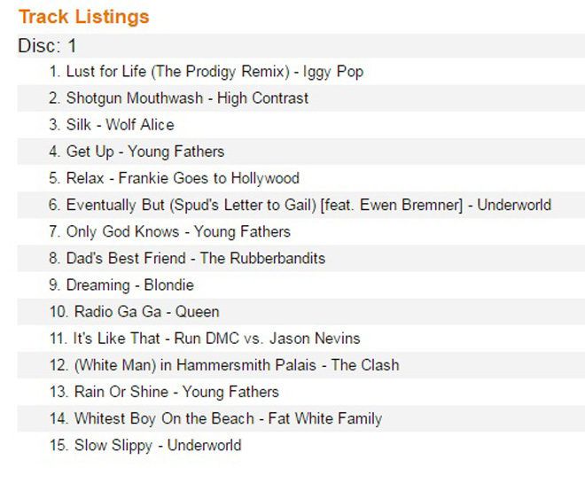 El disco oficial saldrá a la venta el mismo 27 de enero y ya sabemos que cuenta con canciones de artistas como Wolf Alice, The Clash, Queen, Underworld, Iggy Pop (con un remix de The Prodigy), Young Fathers, Blondie, entre otros. Vean la lista completa a continuación y escuchen la playlist del soundtrack que hizo el portal Consequence of Sound.