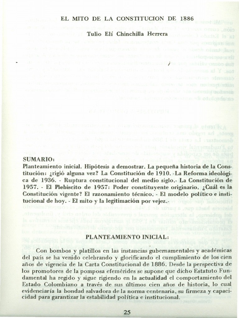 El historiador de la Universidad de Antioquia, doctor en derecho y ciencia política, Tulio Chinchilla publicó en 1986, El mito de la constitución de 1886. En este texto, el autor busca argumentar que dicho documento, por falta de una normativa sólida, no se mantuvo como tal hasta 1991. Hace énfasis en el plebiscito de 1957 para marcar un punto de quiebre y señalar que son estas reformas las que llegan hasta la constitución de 1991, al transformar los ejes principales de la Carta Política de finales del siglo XIX.