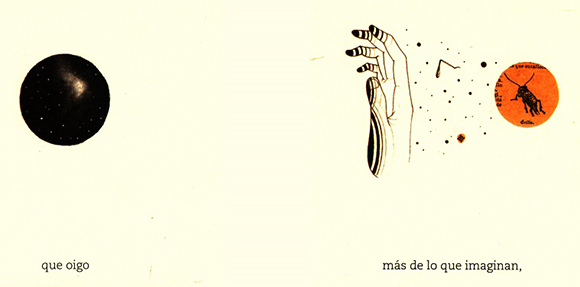 A pesar de que muchas veces se piensa que los libros para personas con discapacidad solo pueden ser para ciegos, la falta de contacto con la palabra de la población con discapacidad auditiva hace que los relatos sean más dispendiosos, por eso Pilar nos invita a mostrarnos esa manera de narrar con las manos y los ojos. El libro, que viene con una ficha explicativa del lenguaje de señas con dibujos, contiene en su carátula el nombre del libro con las figuras ilustradas de las manos y de igual manera en su primera hoja guarda la dedicación "Para Rosita". En adelante las hojas muestran diferentes ilustraciones en las que se adentran la idea de cómo el cerebro relaciona las acciones con los sonidos, ..."que una mirada dulce me canta mejor que las canciones..."