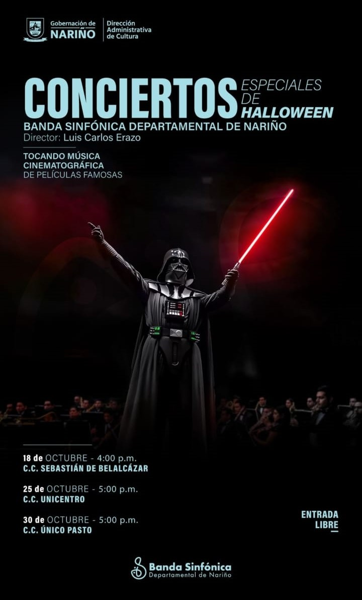 La Banda Sinfónica Departamental de Nariño, bajo la batuta del maestro Luis Carlos Erazo, ofrecerá una serie de conciertos especiales de Halloween en los que interpretarán bandas sonoras de películas icónicas.