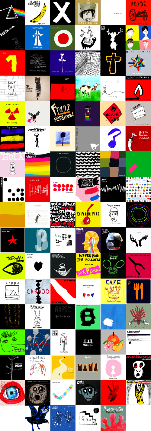 Así, en tardes de lluvia o no, lo hicieron durante dos años, con toda clase de materiales, hasta completar 100. Pasaron por todos los colores desde el "White Album" de Los Beatles hasta el "Black Album" de Metallica. Por varias décadas, del "The Velvet Underground & Nico" 1967 de Velvet Underground (ilustrado originalmente por Andy Warhol) al "AM" 2013 de los Arctic Monkeys. Por varios géneros, del hard rock de AC/DC a la electrónica de Daft Punk.