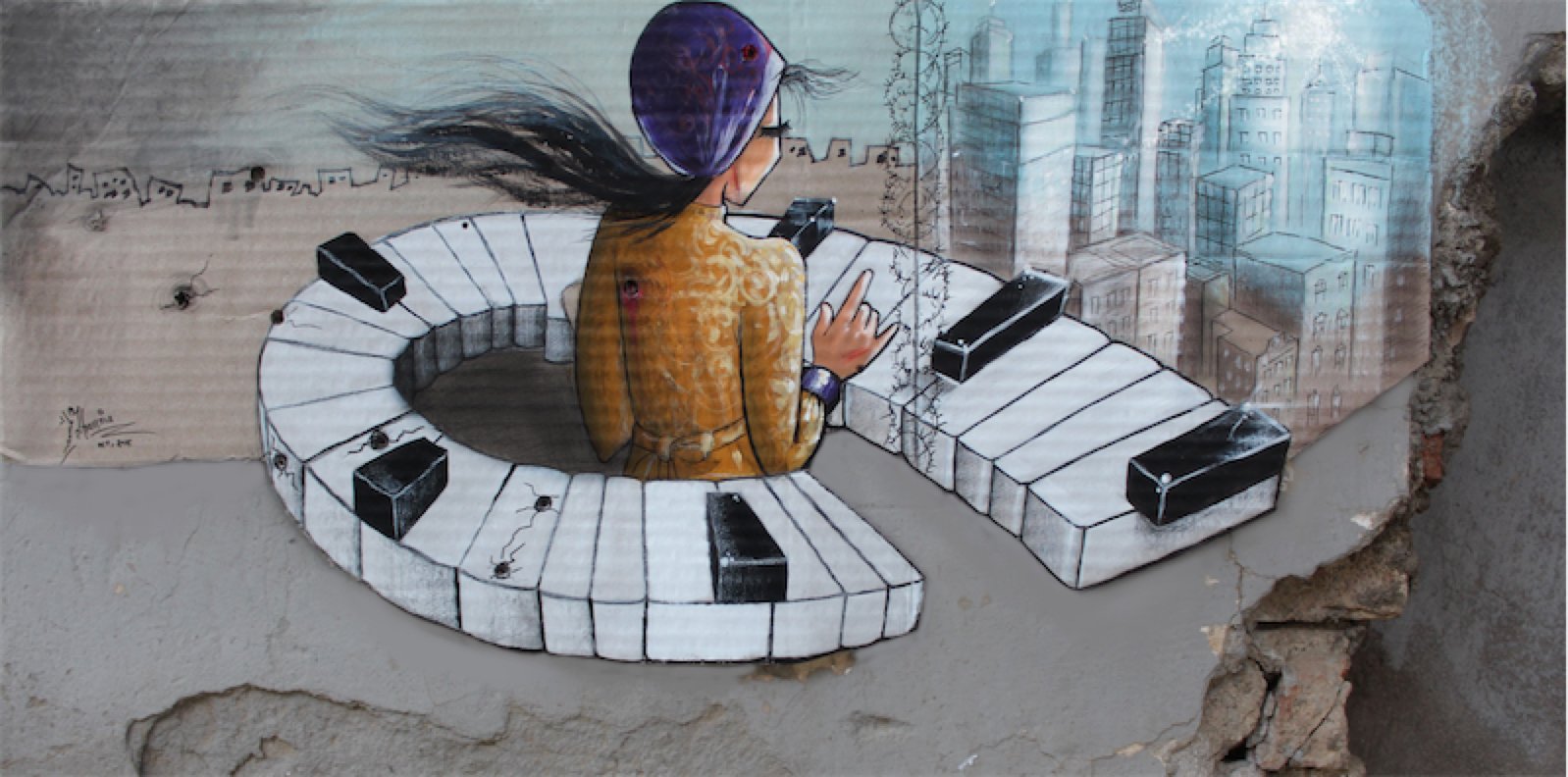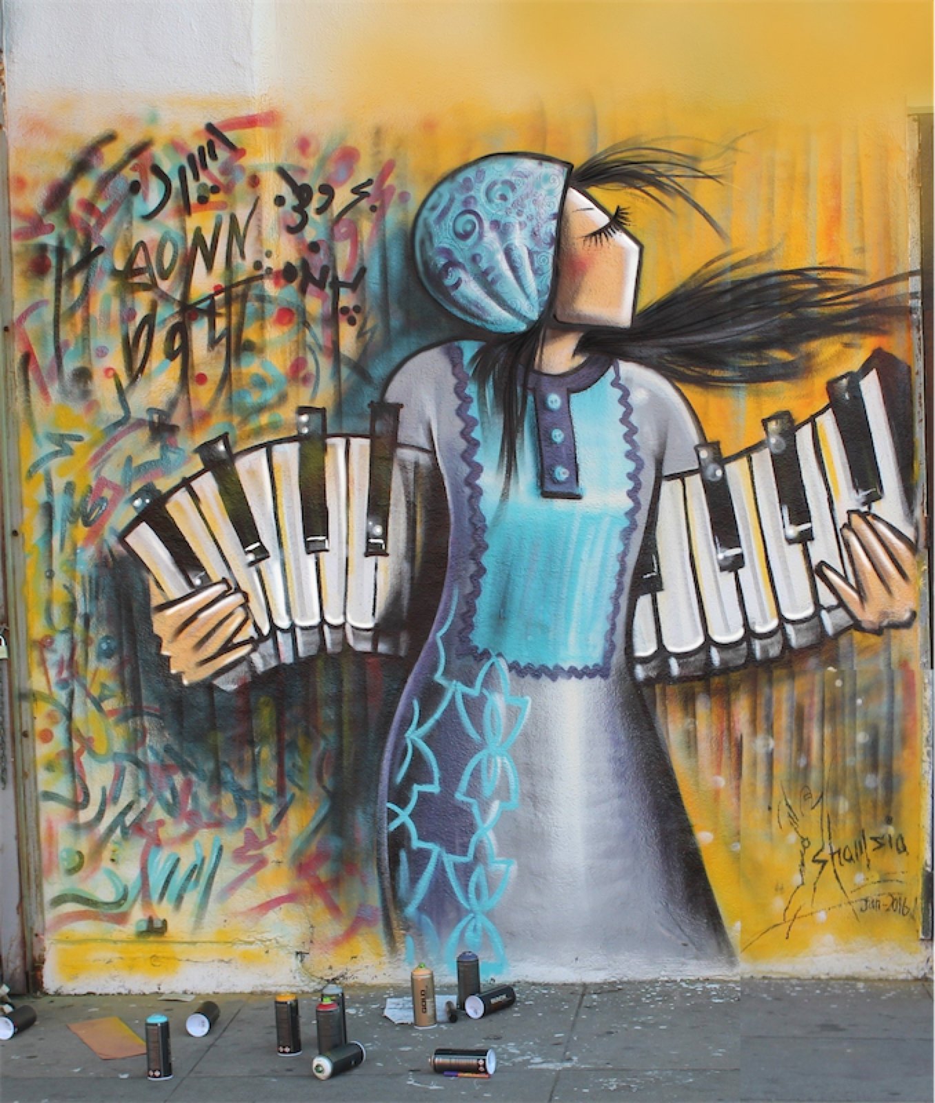 “El arte cambia la mentalidad de las personas, y las personas cambian al mundo”, escribe en su página oficial Shamsia quien es la primera artista urbana de Afganistán. Ella nació en Irán, es hija de refugiados y estudió escultura en la universidad de Kabul. En una entrevista cuenta que descubrió el graffiti gracias a un taller hecho en 2010 por el colectivo internacional Combat Communications, y desde ahí las paredes de Kabul empezaron a llenarse de sus coloridas niñas que sostienen pianos.