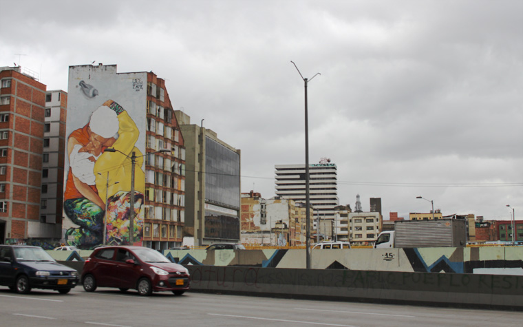 Encontramos finalmene este mural de 23 metros de altura que ha robado miradas de bogotanos y turistas desde julio de 2013. También se encuentra ubicado en el corazón de la ciudad, en la calle 26 con carrera 13, un punto perfecto que ayuda a exaltar su significado, según lo explica Yurika, uno de los artistas que hace parte del Colectivo Vértigo,“Éste es un punto estratégico, pues aquí se divide la Bogotá turística y de postal que se encuentra hacia arriba del beso, y del mural para abajo la Bogotá marginal y peligrosa de donde surge esta historia”.