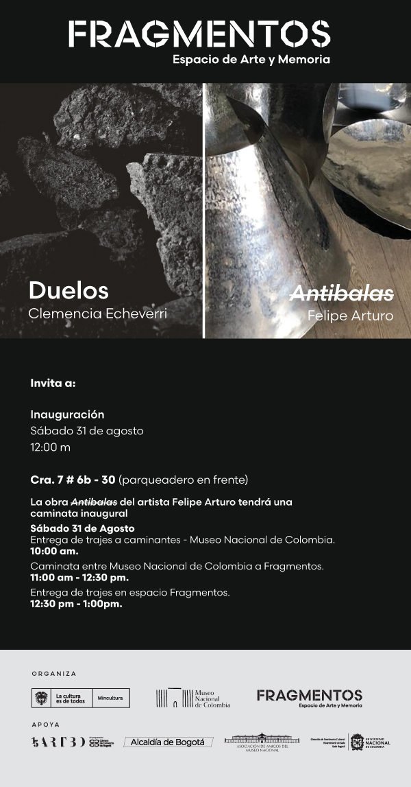 Pues bien, el próximo sábado 31 de agosto, en Fragmentos, Espacio de Arte y Memoria, los artistas Clemencia Echeverri y Felipe Arturo, estarán presentando sus obras ‘Duelos’ y ‘Antibalas’ respectivamente, tras ganar la convocatoria realizada por el Ministerio de Cultura a través del área de Artes Visuales el año pasado.
