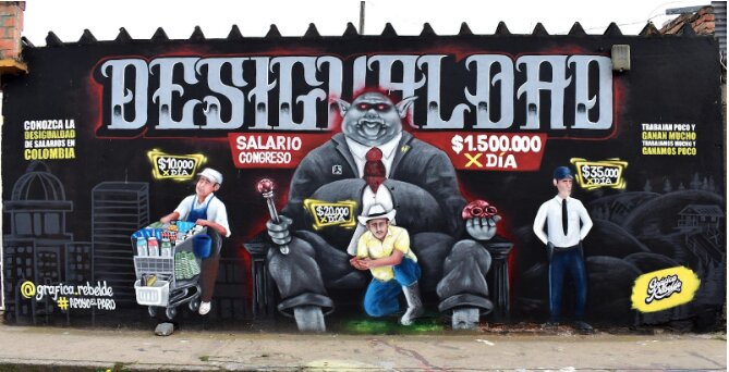 Con una gama de colores oscura, donde predomina el negro y el rojo, el colectivo representó los ingresos de cada persona dependiendo de su labor: un congresista, un trabajador callejero y un asalariado. Las diferencias son abismales. Así lo corroboró el colectivo al unirse con Grafica Rebelde y hacer una juiciosa búsqueda que plasmaron en las paredes.