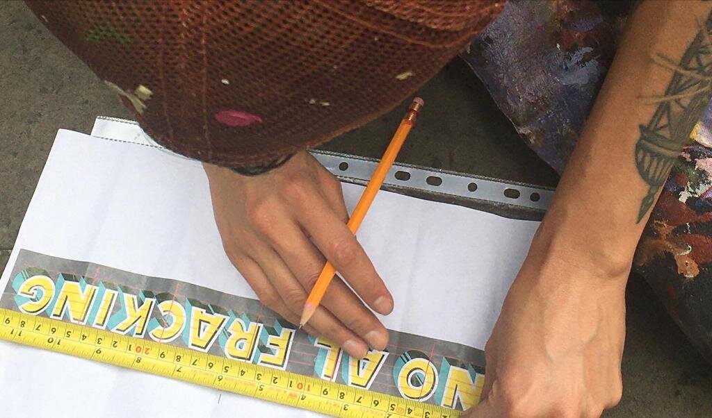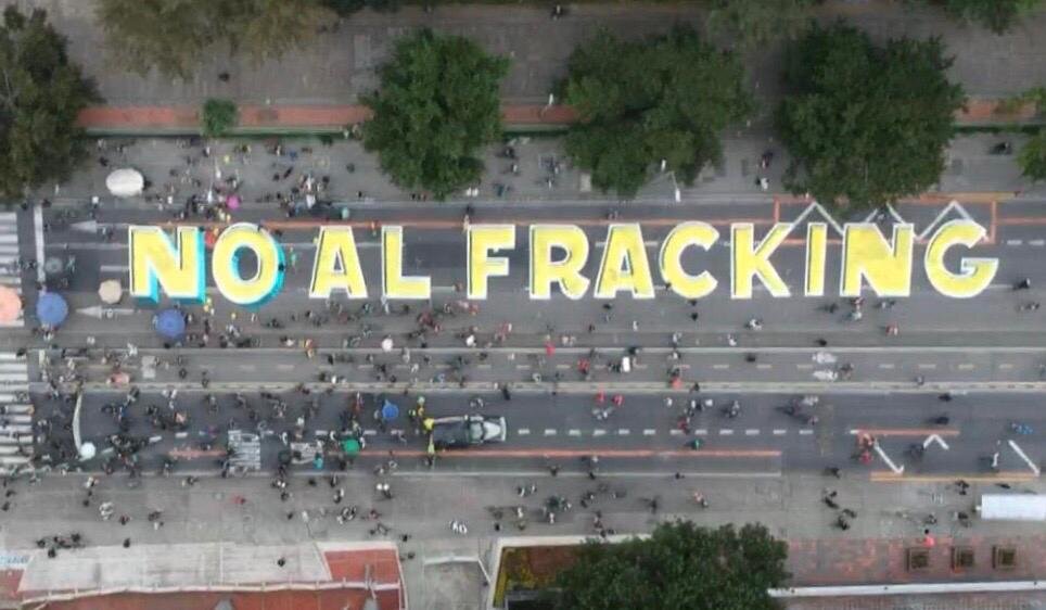 A unos cuantos kilómetros al sur de la JEP, al frente del edificio de Ecopetrol, la Fundación Atempo, junto a varias personas que se sumaron, pintaron un mural en contra del fracking, un procedimiento de fracturamiento del subsuelo que va a ser implementado en Colombia, después de que el Consejo de Estado aprobara el año pasado unos proyectos de investigación, que han sido fuertemente criticados por las comunidades del Magdalena Medio y por varias organizaciones ambientales.