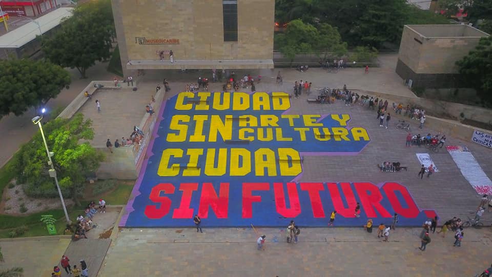 Sobre el suelo de la Plaza Mario Santo Domingo del Museo Cultural del Caribe, se escribieron las palabras: “Ciudad sin arte y cultura, ciudad sin futuro”. Fue un mural realizado por la Acción Colectiva Barranquilla enmarcado bajo la consigna “Hagamos museo” y que pretendió poner sobre la mesa un tema preocupante en la capital del Atlántico: la crisis que atraviesa la cultura y el arte.