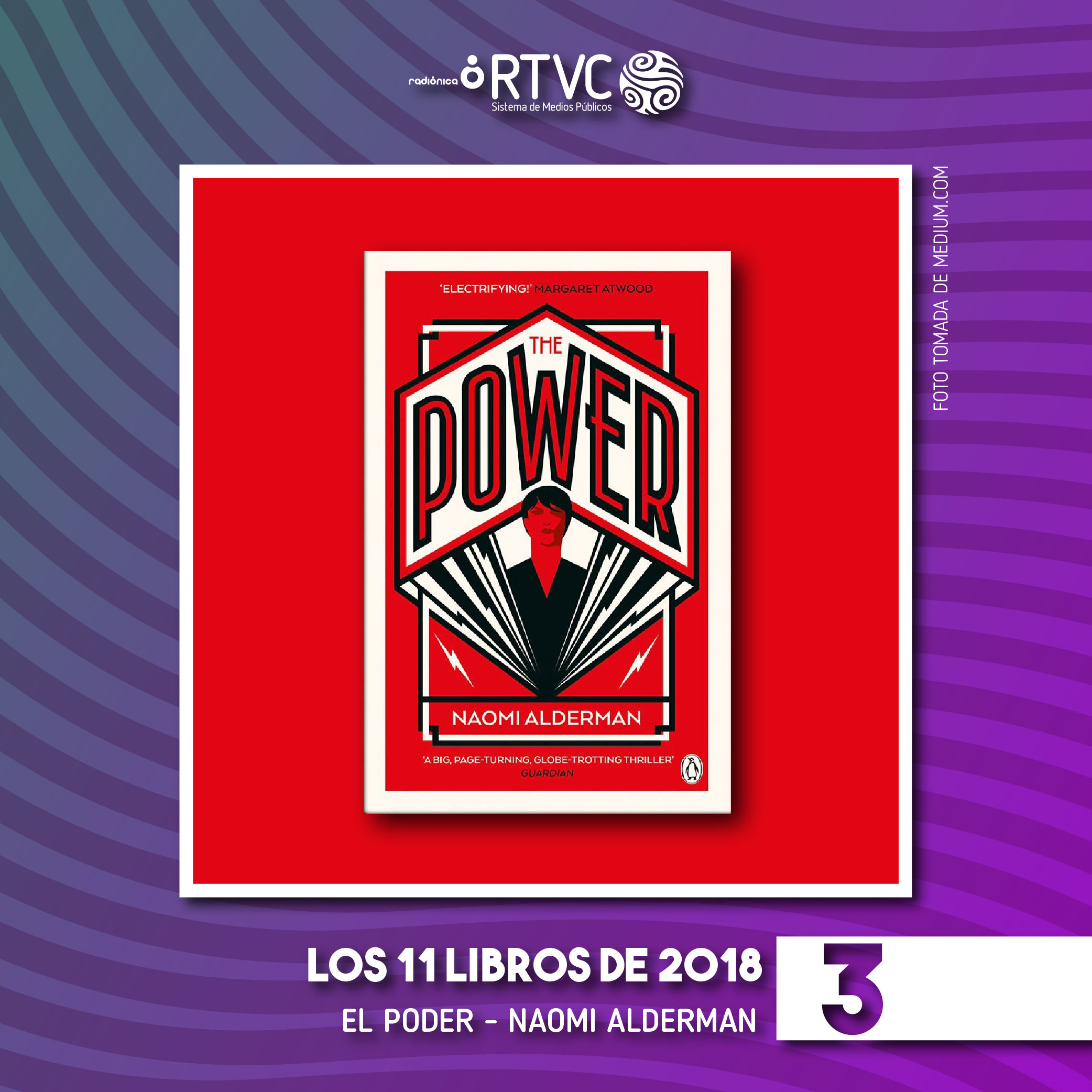 Emocionante y bien elaborada obra de ciencia ficción, publicada en Reino Unido en 2016 y en Colombia en el presente año. Necesaria y oportuna distopía feminista creada por una joven autora, Naomi Alderman, quien a demás de poseer un inspirador presente, está claro que convertirá en una de las creadoras literarias más importantes del mundo.