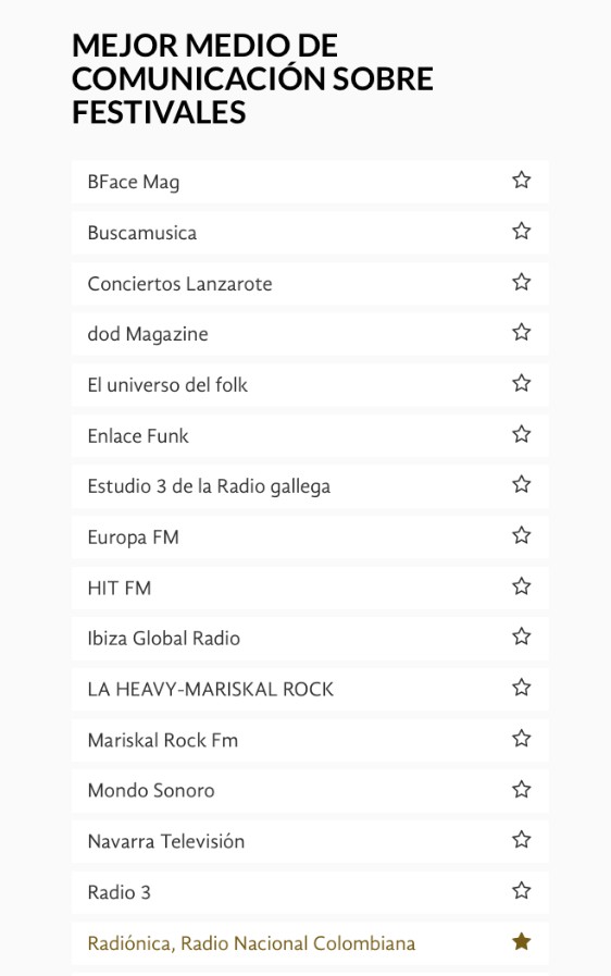La nominación es en la categoría "Mejor medio de comunicación sobre Festivales" que reconoce a Radiónica como un medio de comunicación destacado por la difusión de contenidos, cuantitativa y cualitativamente sobre festivales en España en los diferentes soportes.