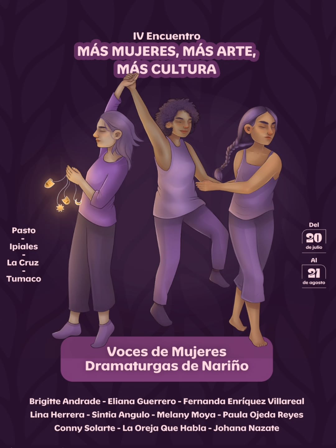 Ahora, le damos la bienvenida al IV Encuentro Más Mujeres, Más Arte, Más Cultura: Voces de Mujeres Dramaturgas de Nariño, que se llevará a cabo del 20 de julio al 21 de agosto en Pasto, Ipiales, Tumaco y La Cruz.