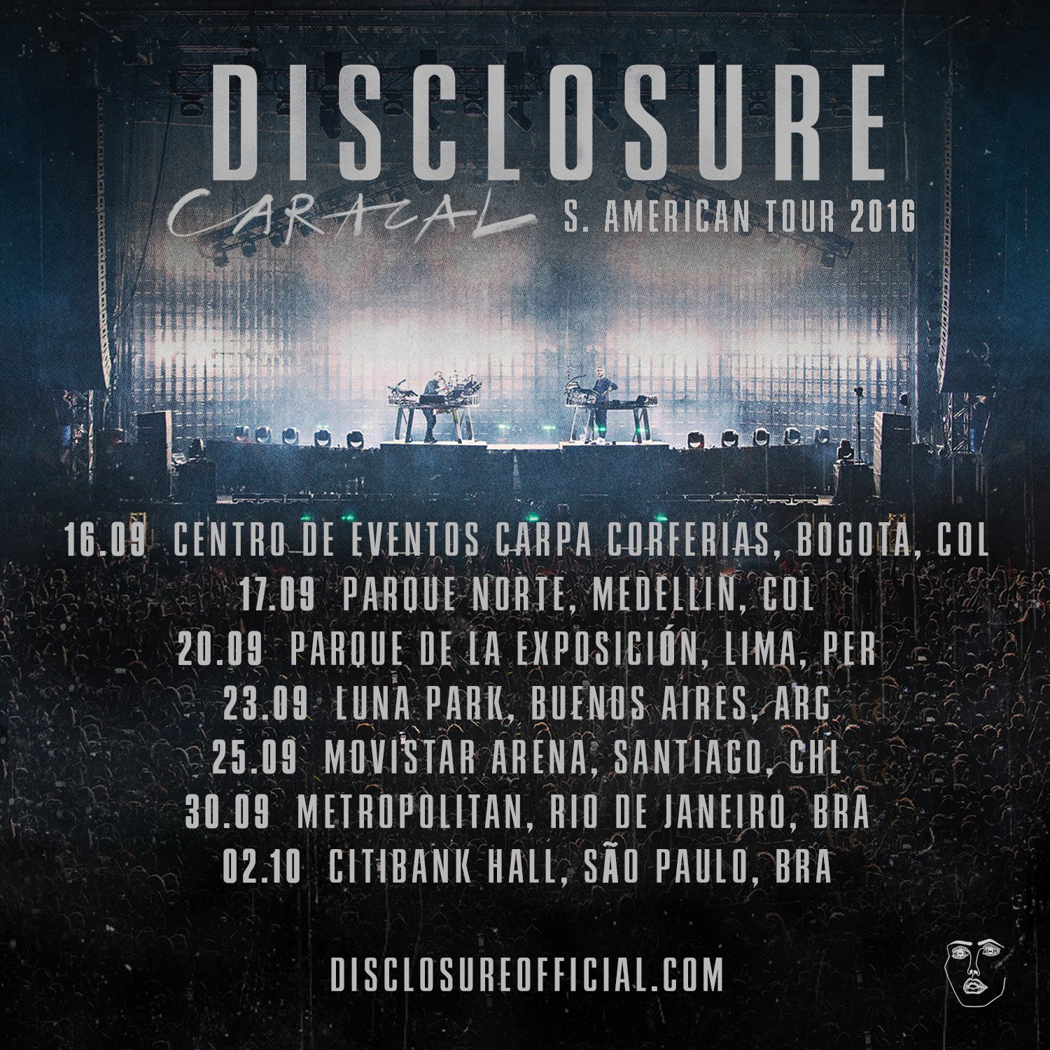 ¡Confirmado! El dúo electrónico conformado por Guy y Howard Lawrence, Disclosure, dio a conocer a través de sus plataformas digitales la noticia de su gira suramericana "Caracal South American Tour 2016".