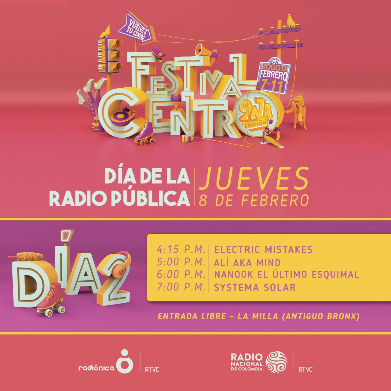 En el marco del Festival Centro, el primer festival musical de Bogotá, la Radio Pública tiene su propio espacio y es por ello que junto a Radio Nacional de Colombia estaremos el próximo 8 de febrero ofreciendo en la calle denominada La Milla, del antiguo Bronx, un concierto que reunirá a artistas que hacen parte de esta gran casa radiofónica. Entre ellos estarán Systema Solar, Ali A.K.A. Mind, Nanook El Último Esquimal, Electric Mistakes, Inguna y Corrientes.