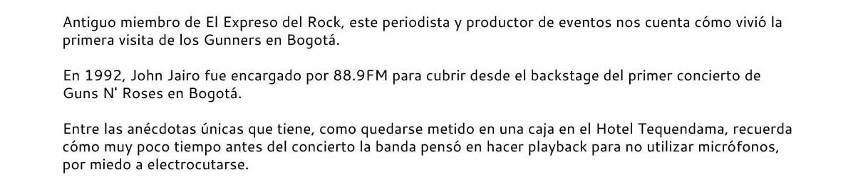 Entrevista: John Jairo Ricaurte recuerda el concierto de Guns en 1992 Entrevista: John Jairo Ricaurte recuerda el concierto de Guns en 1992 facebook X whatsapp Register Martes, 27 Noviembre, 2012 - 12:35 Por: Radiónica Radiónica Recomienda Información guns n' roses el expreso del rock entrevistas videos especiales