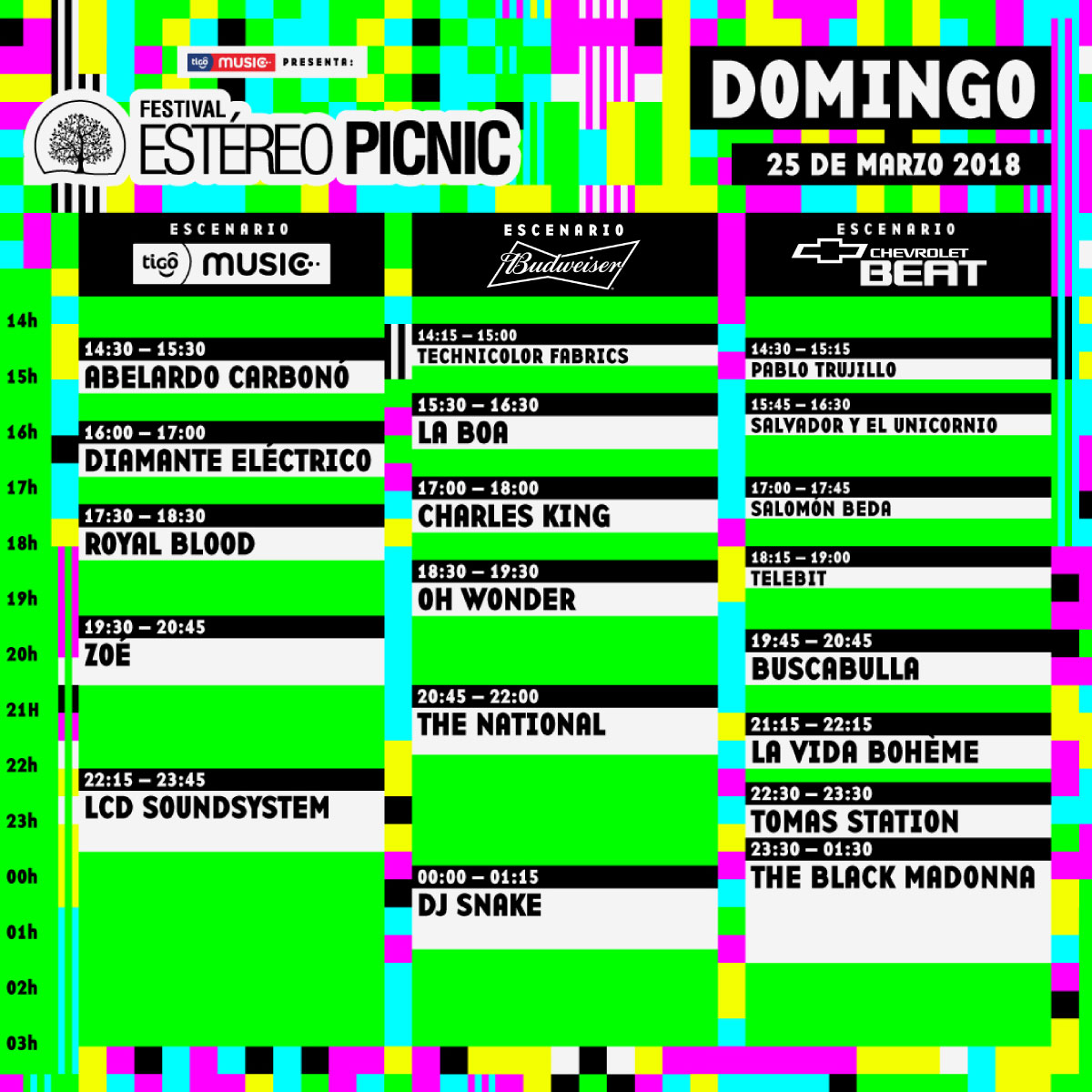 El tercer y último día del Festival Estéreo Picnic 2018 estará cargado de sonidos que ustedes conocen muy bien como los de Diamante Eléctrico, Telebit, Zoé, Charles King y La Vida Bohème (desde Venezuela); También habrá espacio para el baile desenfrenado con bandas como La Boa, Buscabulla o Abelardo Carbonó; Además, el poder rockero de Royal Blood y The National les 'volará la cabeza'; Y por supuesto, no pararán de saltar con los beats de The Black Madona, DJ Snake y un gran regreso esperado, LCD Soundsystem.