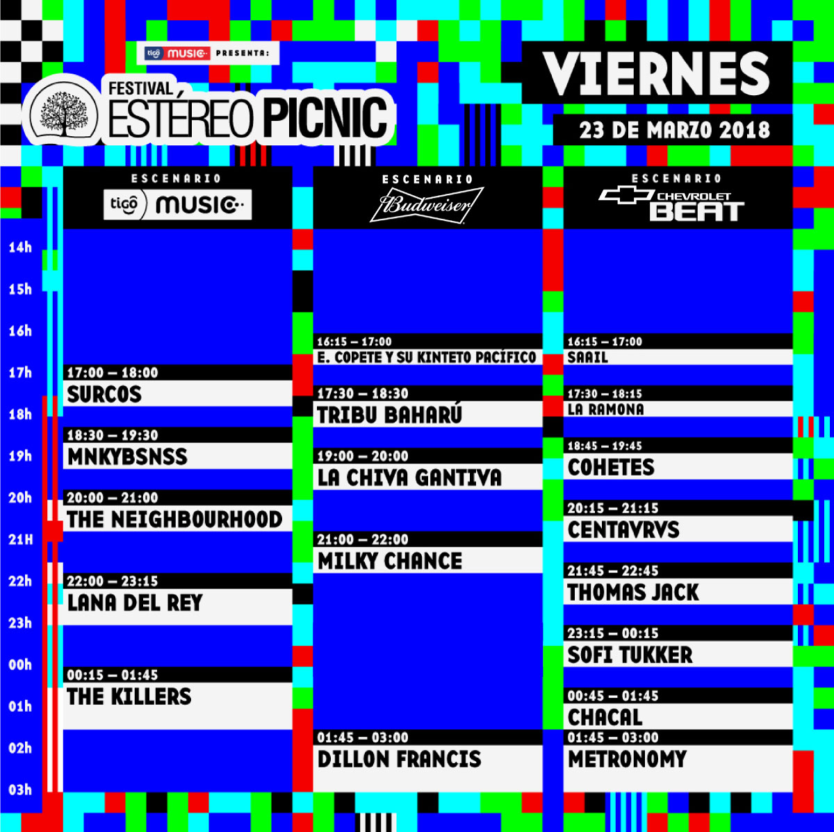 La primera jornada del festival musical más importante del país estará llena de muchos de los sonidos colombianos que ustedes escuchan aquí, en Radiónica, como Tribu Baharú, Surcos, La Chiva Gantiva y Mnkybsnss; propuestas del mainstream electrónico como Sofi Tukker, Milky Chance, Dillon Francis o Metronomy; el indie pop de Lana del Rey y el indie rock, cantable y coreable de The Killers.