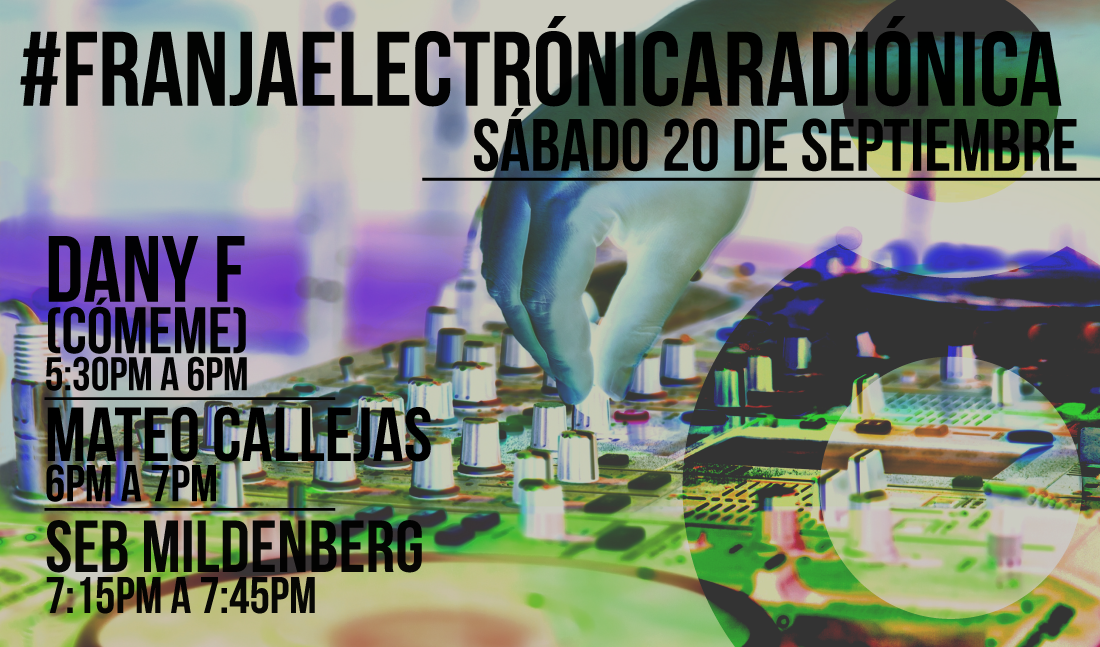 Este sábado nos acompañarán en la mejor franja electrónica de la radio, Dany F (Cómeme), Mateo Callejas (Monofónicos) desde Medellín, y por primera vez, Seb Mildenberg, un productor y DJ bogotano. Los esperamos con los mejores beats para pasar una tarde noche de buenos sonidos.