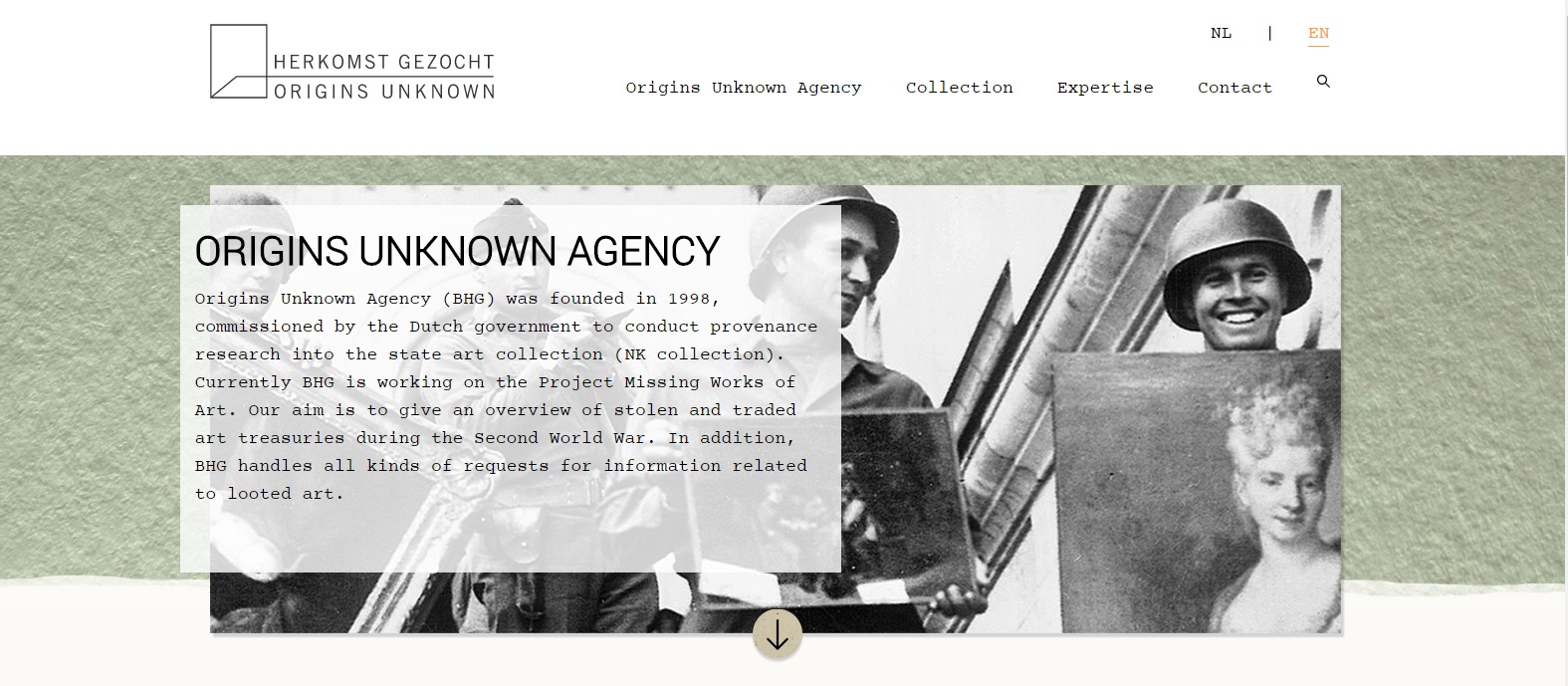 La foto en escala de grises que se aprecia como fondo de la página web es de unos soldados aliados sujetando cuadros recuperados, los famosos Monuments Men que George Clooney inmortalizó en la película de 2014. ¿La vieron?