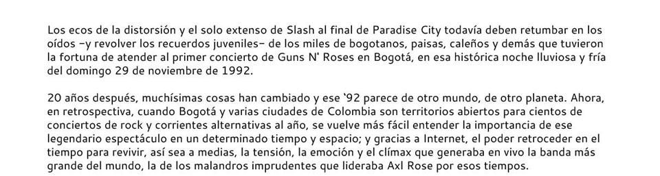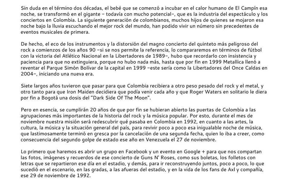 A un mes de que se cumplan dos décadas del concierto en Bogotá de la otrora banda más importante del mundo, queremos recordar este suceso con el material fotográfico y la memorabilia que ustedes conserven de ese mítico evento, compartiéndolo en este grupo de Facebook o en este evento en Google +