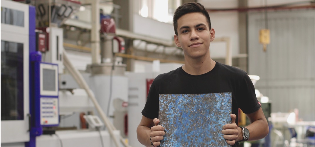 Daniel Estupiñán (18 años) con su proyecto Desarrollo y Evaluación de un compuesto polimérico a partir de polipropileno reforzado con fibras del bagazo de la caña de azúcar. Categoría Ondas.