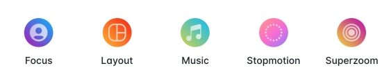 En esta ocasión la app ha cambiado por completo el diseño de sus íconos, también ha añadido nuevas opciones, tenemos Focus, Layout, Music, Stop Motion y Superzoom.