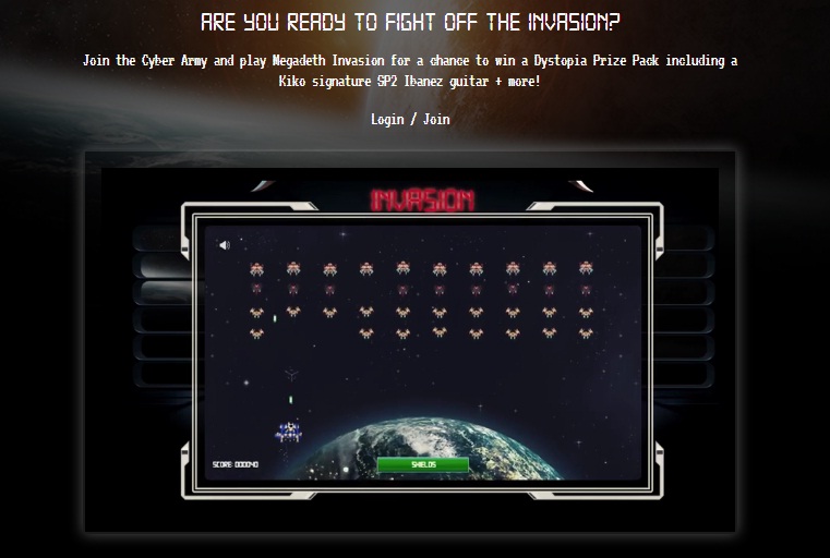 Por su parte la banda de trash metal Megadeth ha decidido retar a sus fanáticos en un videojuego retro que recuerda a Space Invaders, se trata de Megadeth Invasion, una plataforma vinculada a su página web en donde los usuarios pueden jugar con su nave espacil a eliminar a los invasores sin salir herido, poco a poco se puede subir de nivel y vencer a los demás contrincantes para llevarse los premios.