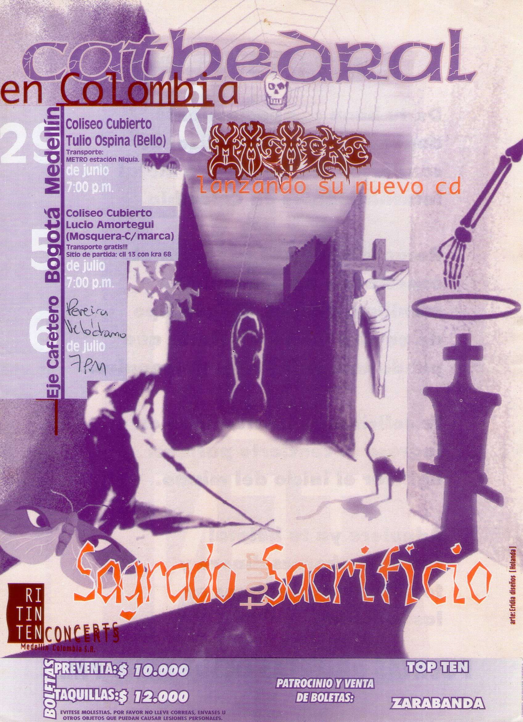 Durante los 90 no hubo muchos conciertos de bandas internacionales; sin embargo, fue una de las épocas más emocionantes para el metal colombiano. En estos años se consolidó esta cultura en todo el país, nacieron bandas icónicas y el Colombia empezó de a poco a entrar en los circuitos de giras. Y la primera banda de metal extremo que se animó a venir fue Cathedral. Este grupo inglés, del cual El Tiempo de esa época dijo que: “su sonido es pesado y lento, con ambientes un tanto depresivos”; se presentó en Medellín, Pereira y Mosquera y este último municipio fue especial porque hordas de metaleros llegaron de toda Cundinamarca para ver a Cathedral y a Masacre. Existe incluso un mito que afirma que el cementerio fue profanado, pero más allá de eso, lo que fue seguro es que fue una fiesta irrepetible.