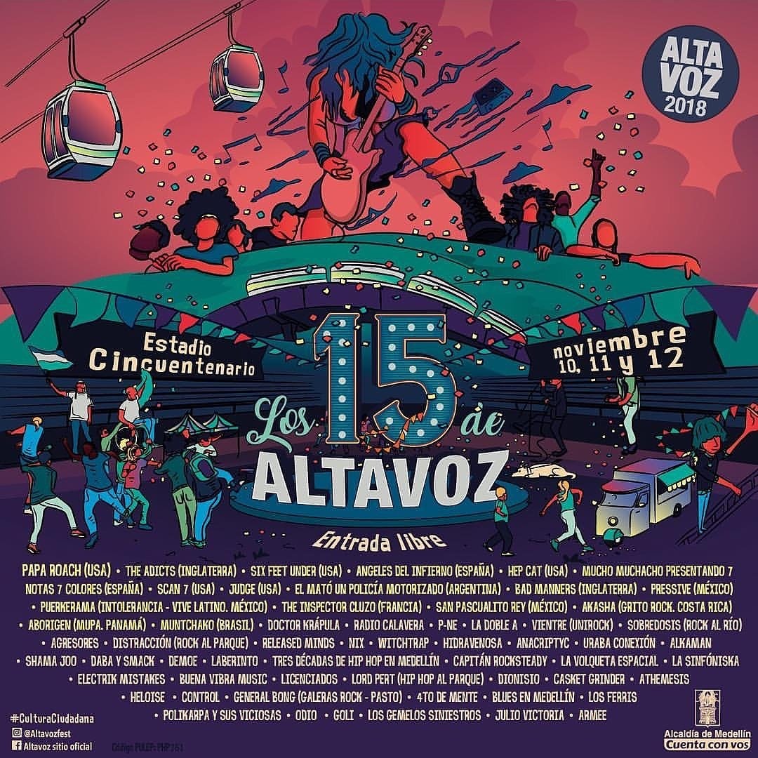 El carte de Altavoz Fest 2018 lo integran: Papa Roach (USA), The Adicts (Inglaterra), Six Feet Under (USA), Ángeles del Infierno (España), Hepcat (USA), Mucho Muchacho Presentando 7 Notas 7 Colores (España), Scan 7 (USA), Judge (USA), Él Mató Un Policía Motorizado (Argentina), Bad Manners (Inglaterra), Pressive (México), Puerkerama (Intolerancia - Vive Latino - México), Inspector Cluzo (Francia), San Pascualito Rey (México), Akasha (Grito Rock - Costa Rica), Aborígen (MUPA - Pánama), Muntchako (Brasil), Doctor Krápula, Radio Calavera, P-NE, La Doble A, Vientre (Unirock), Sobredosis (Rock Al Río), Agresores, Distracción (Rock Al Parque), Released Minds, Nix, Witchtrap, Hidravenosa, Anacriptyc, Uraba Conexión, Alkaman, Shama Joo, Daba y Smack, DMOE, Laberinto, Tres Décadas de Hip Hop en Medellín, Capitán Rocksteady, La Volqueta Espacial, La Sinfoniska, Electric Mistakes, Buena Vibra Music, Licenciados, Lord Pert (Hip Hop Al Parque), Dionisio, Casket Grinder, Athemesis, Heloise, Control, General Bong (Galeras Rock - Pasto), 4to de Mente, Blues en Medellín, Los Ferris, Policarpa y sus Viciosas, Odio, Goli, Los Gemelos Siniestros, Julio Victoria y Armee.