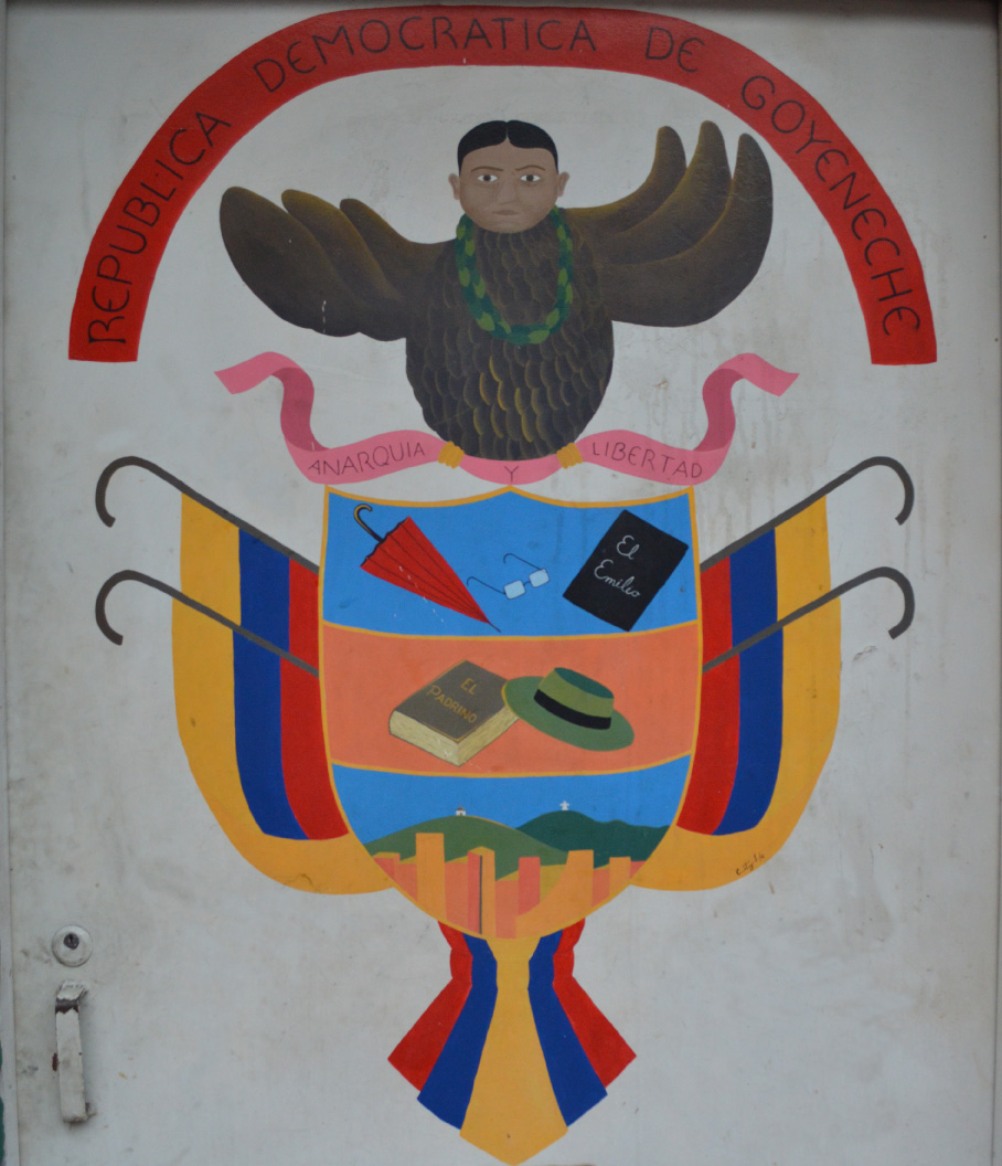 Un lugar acogedor, perfecto para disfrutar de un buen café, conversar y además conocer un poco de la historia de la capital. Dentro del café se pueden observar varias fotografías de Bogotá y otras de Goyeneche así como algunas de sus disparatadas pero creativas propuestas presidenciales. También está pintado el escudo de la República Democrática de Goyeneche, bastante similar al de Colombia con algunas pequeñas diferencias, el cóndor lleva la cara del candidato vitalicio y la consigna en este no es “Libertad y Orden”, sino “Anarquía y Libertad”. En lugar de los cuernos que simbolizan la riqueza y abundancia de frutas y verduras hay unas gafas, una sombrilla y un libro titulado 'El emilio’. Finalmente en la parte inferior se pueden observar las imponentes montañas de Bogotá y algunos de sus edificios.