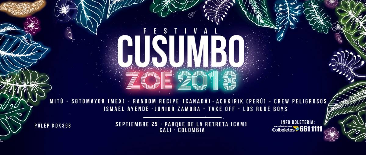 Dentro de los artistas del Festival Cusumbo 2018 hay varios invitados internacionales: Zoé y Sotomayor de México, Random Recipe de Canadá y Achekirik de Perú. La cuota de talento nacional va con Mitú, Ismael Ayende y Crew Peligrosos. Y los caleños no se quedan atrás, estará Junior Zamora, Take Off y Los Rude Boys.