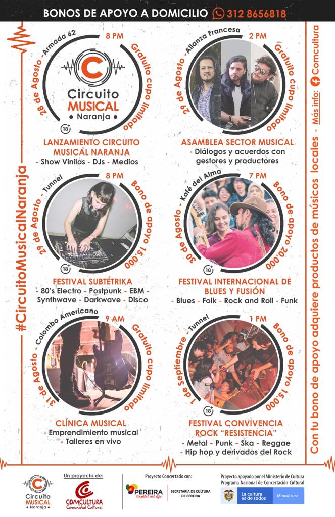 Motivados por la necesidad que siempre ha tenido la ciudad de Pereira de ofrecer eventos culturales alternativos en los que incluir diferentes expresiones artísticas pero sobre todo expresiones musicales, nace el Circuito Musical Naranja, un proyecto impulsado por la Corporación Comcultura, y que en concertación con la Secretaría de Cultura de Pereira y con el apoyo del Ministerio de Cultura, realiza su primera versión.