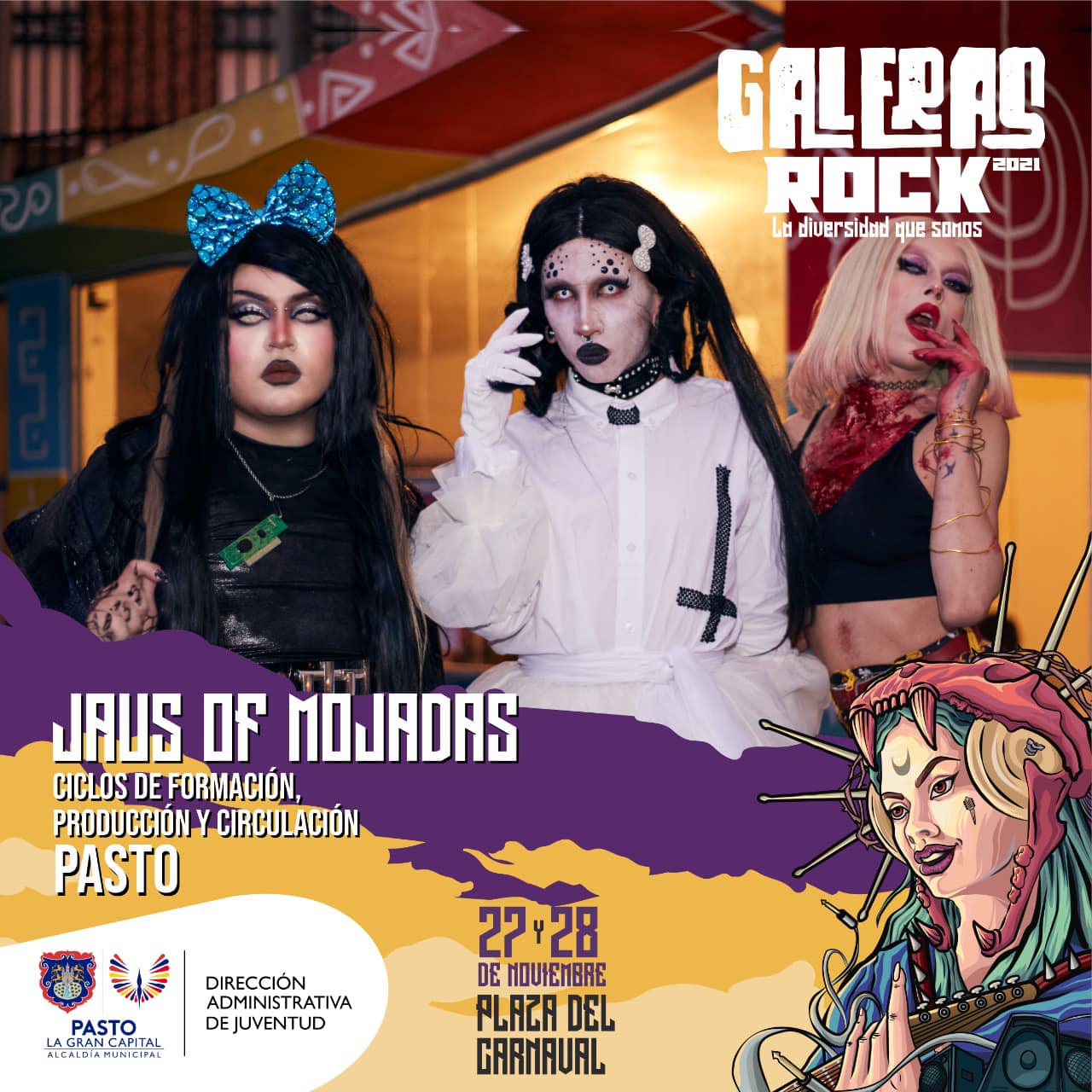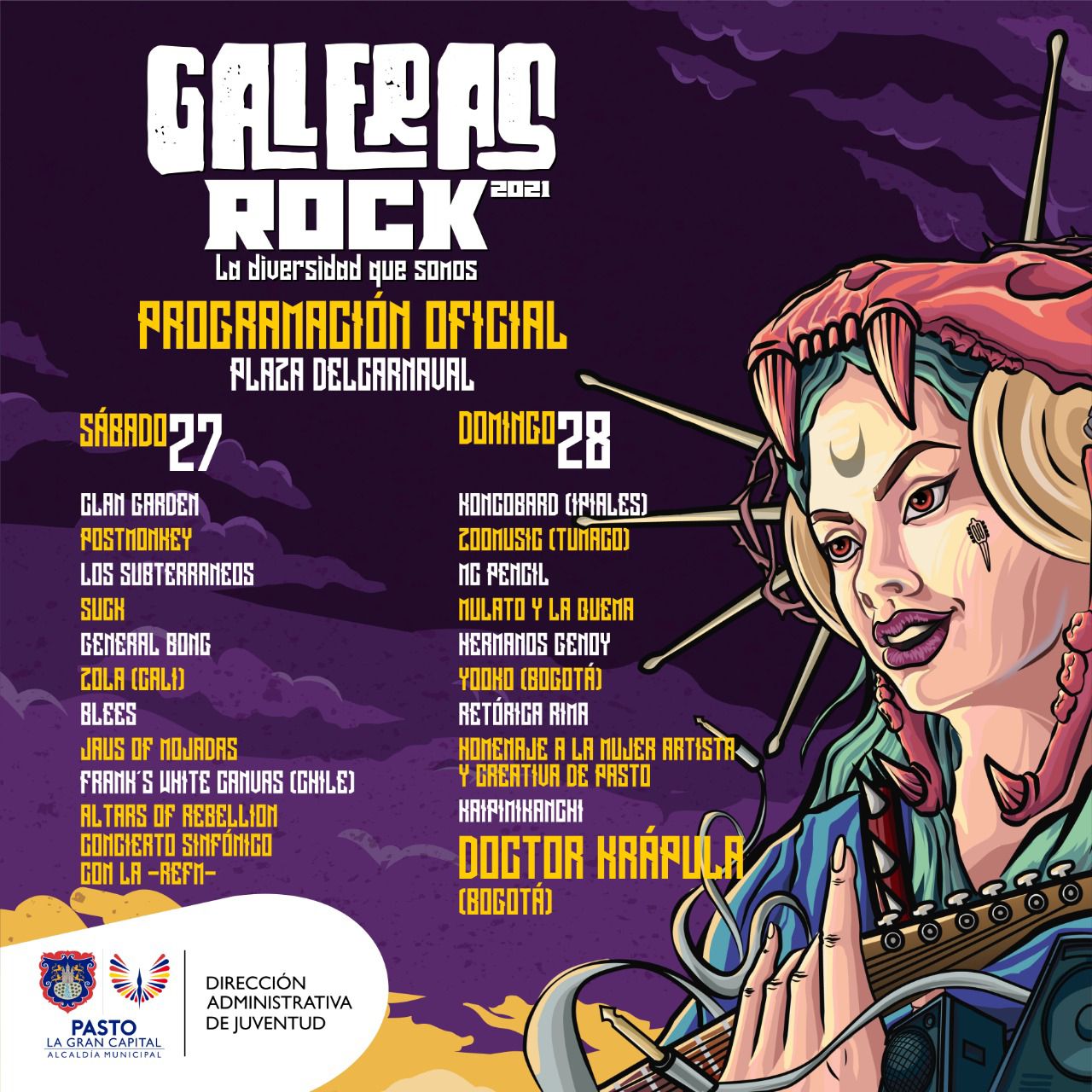 Esta será una fiesta consiente, tolerante, desde la rebeldía, el amor y la construcción crítica y propositiva, con una programación distinta que celebra la diversidad que somos. Les compartimos la programación oficial del Galeras Rock 2021: