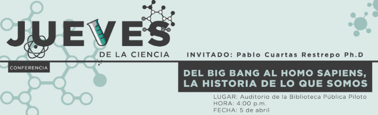 Del Big Bang al Homo Sapiens, la historia de lo que somos se realizará el próximo 5 de abril en la Torre de la Memoria de la Biblioteca Pública Piloto a las 5 de la tarde y es de entrada libre.
