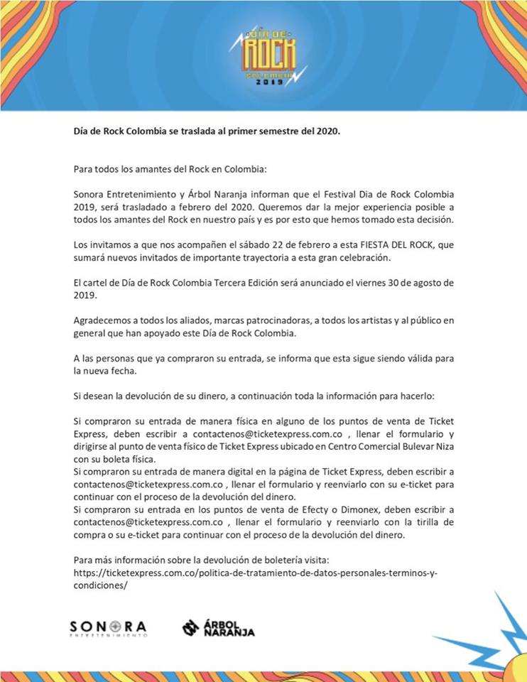 Sin embargo los organizadores acaban de anunciar que el festival fue aplazado para el 22 de febrero del 2020, con el fin de darle al público una mejor experiencia y al parecer nuevas bandas, pues anunciaron un nuevo anuncio del cartel que se dará a conocer el próximo 30 de agosto.