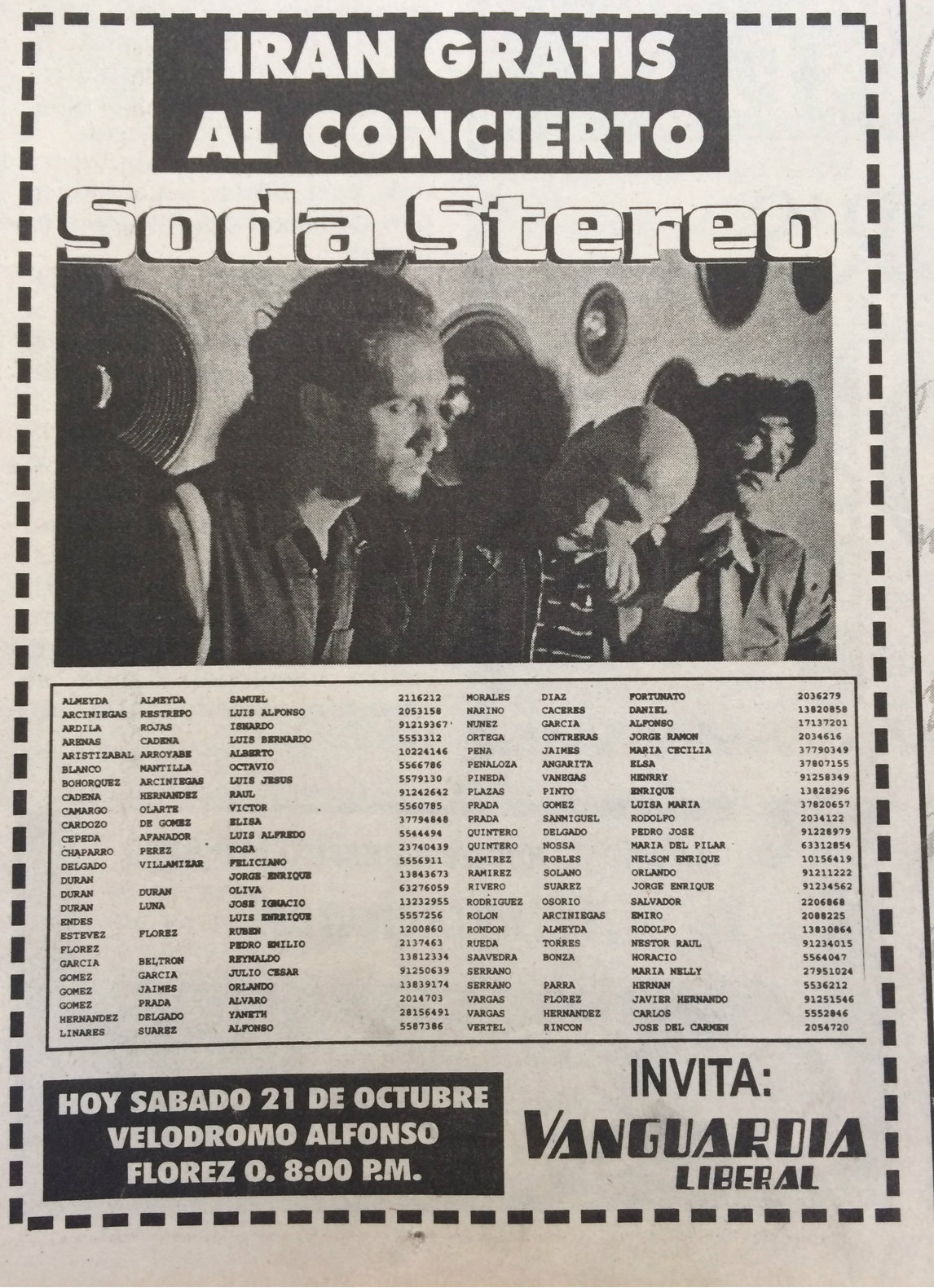 Más temprano, ese 21 de octubre de 1995, confirmaron que cumplirían el sueño de ver a Soda Stereo en Bucaramanga. Sus nombres aparecieron junto a los de otras 47 personas en el periódico insignia de los santandereanos: Vanguardia Liberal. En un recuadro a blanco y negro se leía en la sección de Espectáculos, que quienes aparecían en aquella lista asistirían gratis al concierto de la banda argentina por invitación de este medio de comunicación. Los concursantes debieron esperar una semana para conocer si serían los ganadores, y seguramente valió la pena abrir la prensa ese día para ver los resultados.