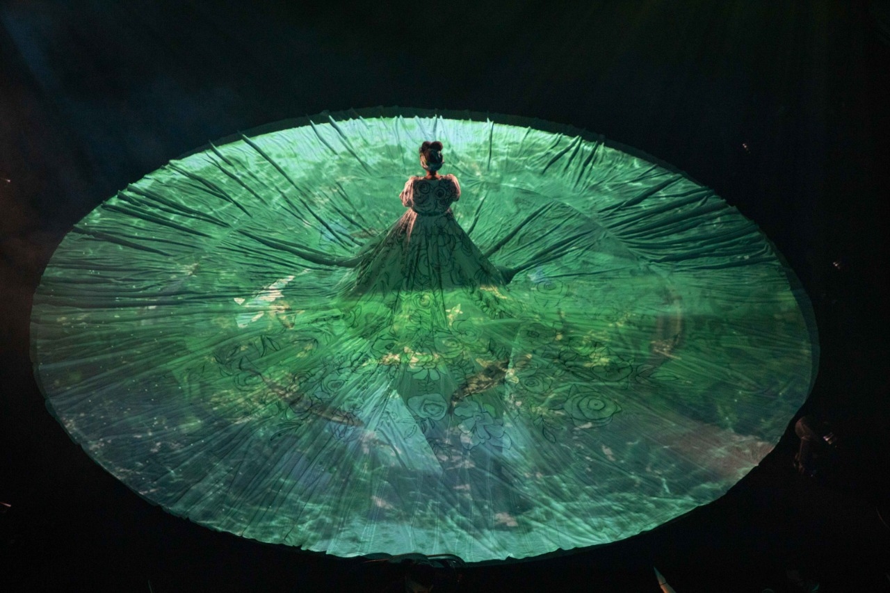 De lo destacado del espectáculo, a pesar de esta nueva normalidad, fue el bello vestido diseñado y pintado a mano por Margarita Yepes, diseñadora del Taller Croquis. Un diseño exclusivo de 27 metros de tela en el que se proyectó la riqueza de mares, ríos, selva y los colores de nuestro Pacífico, el lienzo perfecto para contar una historia.